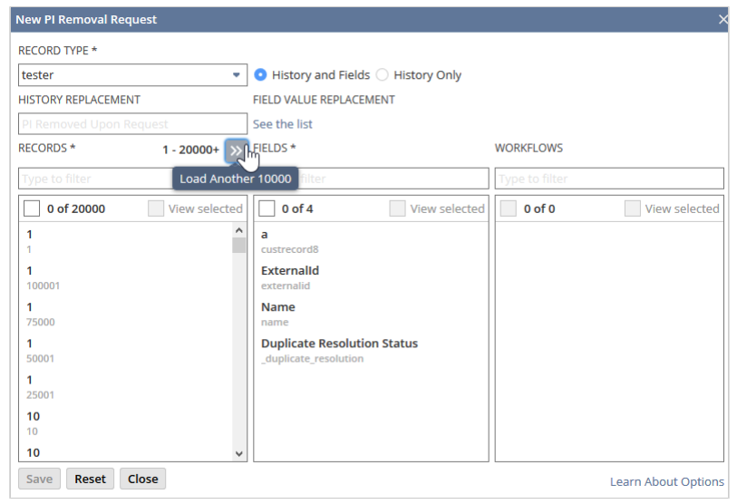 Changes made to Personal Information (PI) Removal in 2020.2 improve usability and performance when loading a large number of records. To improve load times, the Records column now displays only partial information about the record. Many interface changes have been made to the tool to make it easier to remove/edit PII to help adhere to regulatory requirements.